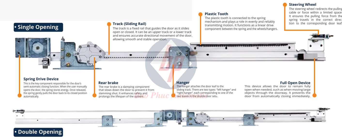 Tích trữ năng lượng khi cửa mở và tự động kéo cửa về khi đóng, đảm bảo chuyển động nhẹ nhàng.